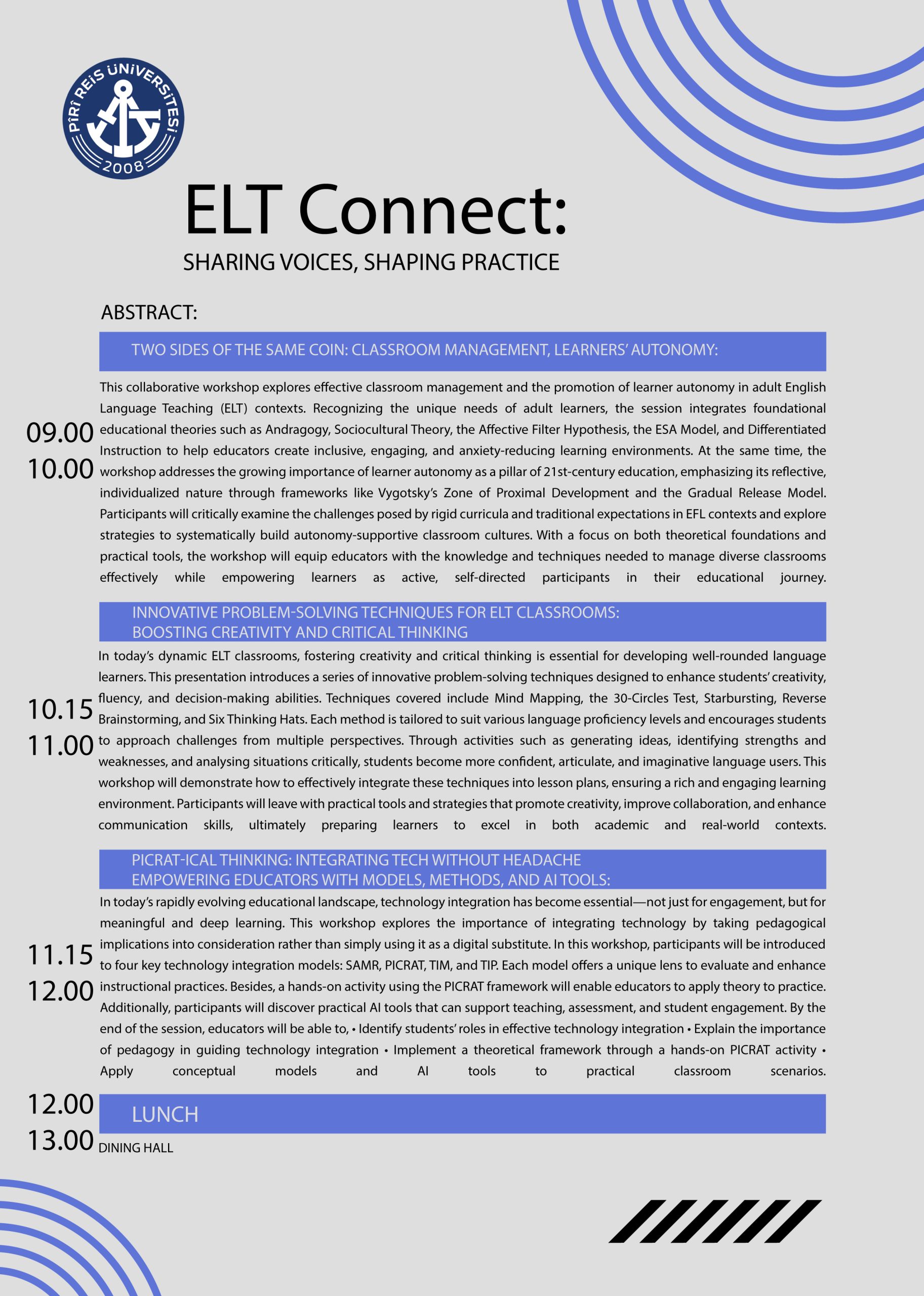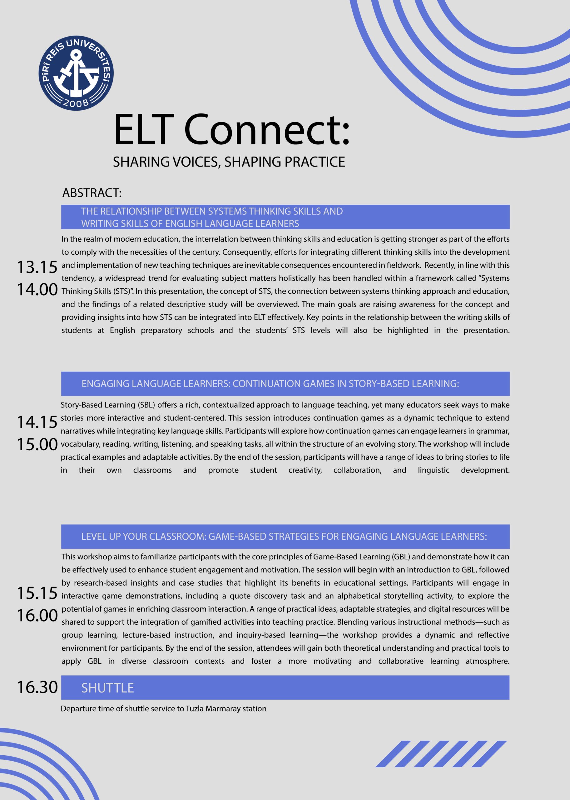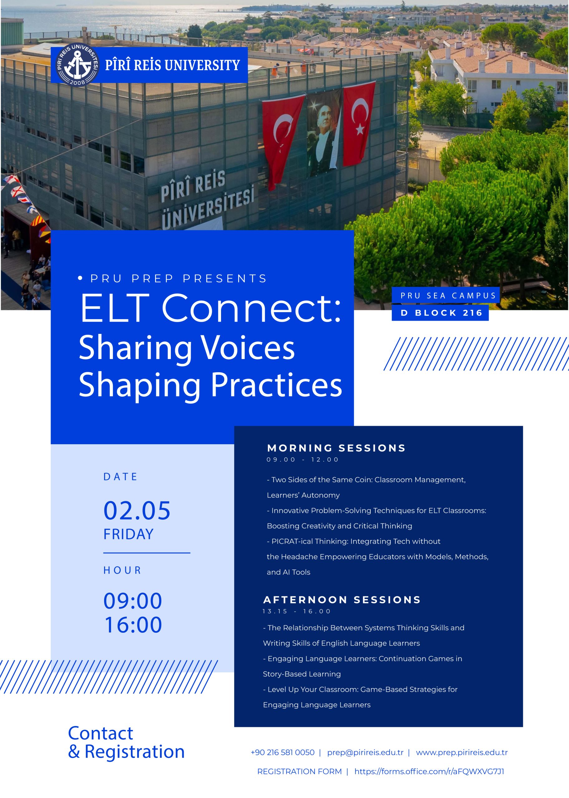 Pîrî Reis Üniversitesi’nin ilk akdredite akademik birimi olan İngilizce Hazırlık Bölümü tarafından düzenlenen “ELT Connect: Sharing Voices, Shaping Practices” etkinliğimizi duyurmaktan heyecan duymaktayız.