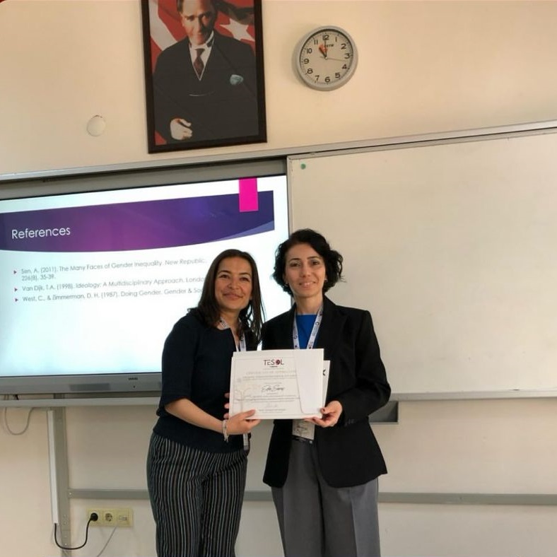 Üniversitemiz öğretim görevlilerinden Eda Saraç, TESOL ‘un Kayseri Erciyes Üniversitesi’nde düzenlediği ELT konferansına katıldı. Kendisi, “Gender Equality in ELT Classroom: Challenges, Struggles and Solutions” adlı sunumunu gerçekleştirdi. Değişik ülkelerden gelen akademisyenlerin sunumlarını gerçekleştirdiği TESOL’un düzenlediği konferansta çok verimli bir tartışma ve paylaşım ortamı gerçekleşti. Sunumda, İngilizce Hazırlık Okulları’nda okutulan kitapların içeriklerinin, metinlerinin ve görsellerinin cinsiyet eşitliği anlamında ne ifade ettiği katılımcılarla beraber tartışıldı. Arkasından soru- cevap seansı gerçekleştirildi.